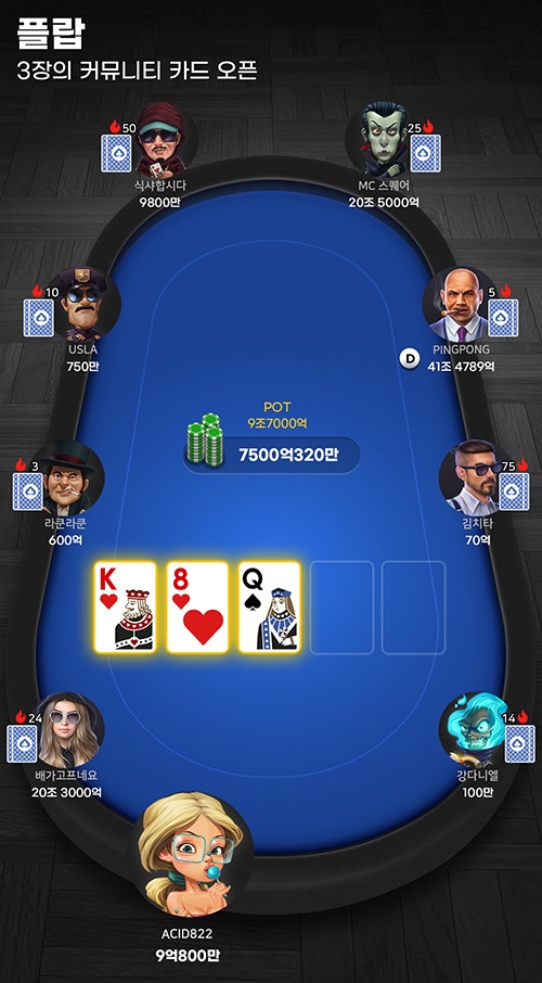 ํ”Œ๋ž ์ดํ›„ ํฌ์ŠคํŠธ ํ”Œ๋ž์œผ๋กœ ์ง„ํ–‰๋˜๋ฉฐ, ํ”Œ๋ ˆ์ด์–ด๋Š” 3์žฅ์˜ ์ปค๋ฎค๋‹ˆํ‹ฐ ์นด๋“œ๊ฐ€ ์ž์‹ ์˜ ํ•ธ๋“œ ์นด๋“œ์™€ ์–ด๋–ค ์กฐํ•ฉ์ด ๋˜์—ˆ๋Š”์ง€์— ๋”ฐ๋ผ ์ฒดํฌ, ๋ฒ ํŒ…, ์ฝœ, ํด๋“œ ๋˜๋Š” ๋ ˆ์ด์ฆˆ๋ฅผ ํ•  ์ˆ˜ ์žˆ์Šต๋‹ˆ๋‹ค.