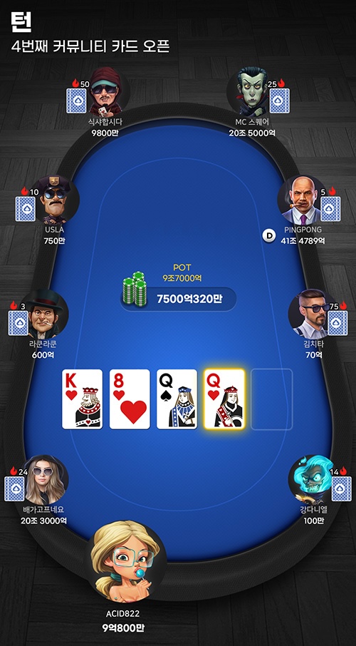 ์ข‹์€ ํ•ธ๋“œ๋ฅผ ๊ฐ€์ง„ ์ฒ™ ํ—ˆ์„ธ๋ฅผ ๋ถ€๋ ค ์ƒ๋Œ€๋ฐฉ์„ ํด๋“œ ์‹œํ‚จ๋‹ค.