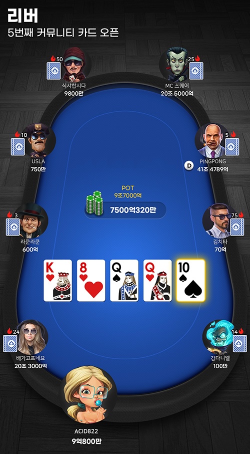 5๋ฒˆ์งธ ์ปค๋ฎค๋‹ˆํ‹ฐ ์นด๋“œ(๋ฆฌ๋ฒ„)๊ฐ€ ์˜คํ”ˆ๋˜๊ณ , ํ”Œ๋ ˆ์ด์–ด๋Š” ์ž์‹ ์˜ ์กฑ๋ณด๊ฐ€ ์–ด๋–ป๊ฒŒ ์™„์„ฑ๋˜์—ˆ๋Š”์ง€ ์•Œ๊ฒŒ๋ฉ๋‹ˆ๋‹ค.